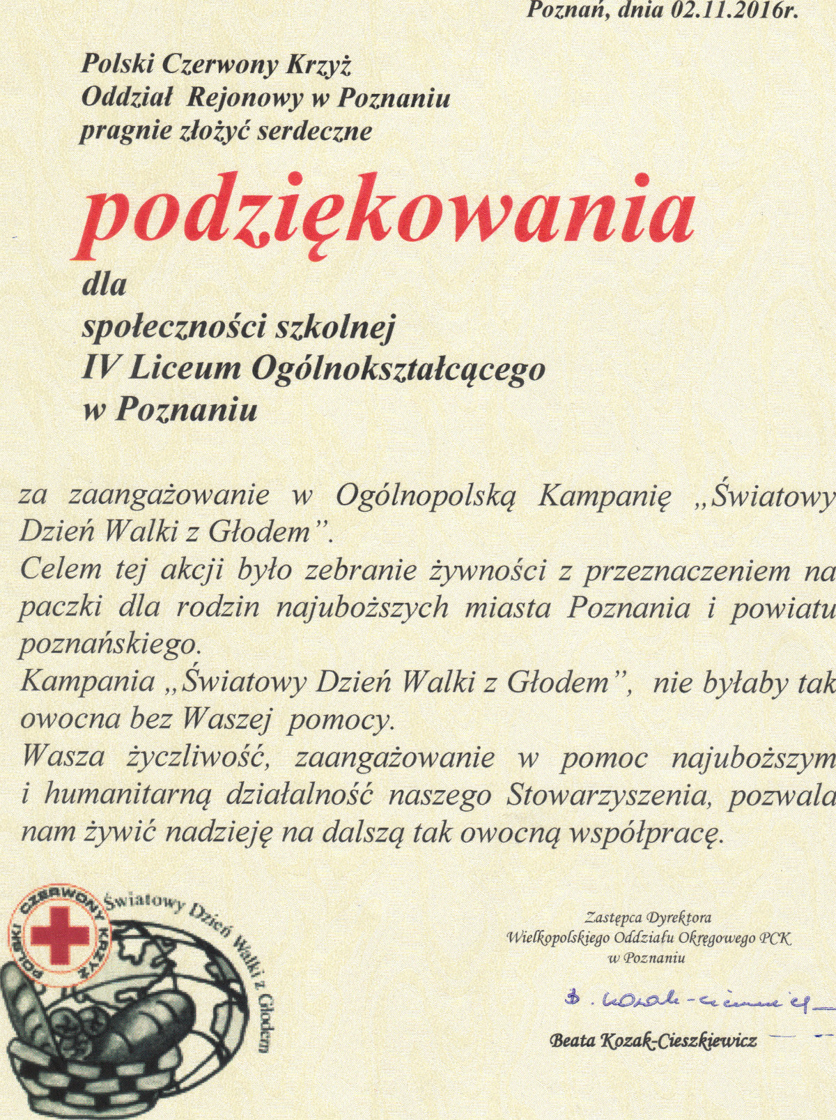 Miło nam poinformować, że społeczność szkolna IV LO otrzymała podziękowania za zaangażowanie