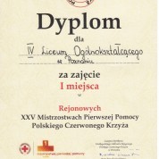 Z radością informujemy, że drużyna reprezentująca IV LO zajęła I miejsce w etapie rejonowym XXV Mistrzostw Pierwszej Pomocy PCK. Naszą szkołę reprezentowali: Martyna Kaczmarek i Aniela Mielcarska z klasy 3c, Wiktoria Woźniak z klasy 2b, Nicole Leporowska i Dominika Łoszczyńska z klasy 1b oraz Zuzanna Krakowska z klasy 1c.