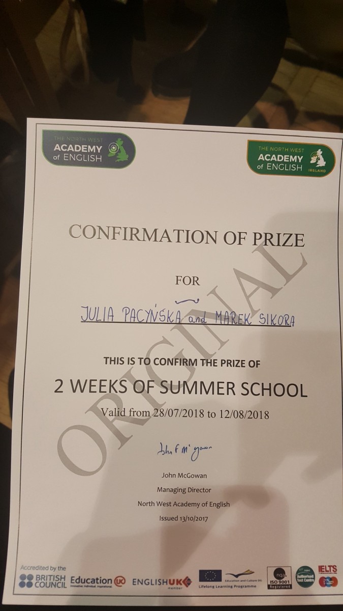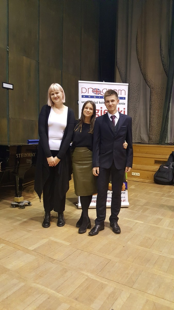 Jest nam miło poinformować iż uczniowie IV LO odnieśli ogromny sukces, zdobywając 1 miejsce w ścisłym finale Konkursu Poezji Irlandzkiej. Finał odbył się w dniu 13.10. br., w aulii szkoły muzycznej przy ul. solnej w Poznaniu. Julia Pacyńska z klasy 2F pokonała blisko 40 uczestników finału, wykonując piosenkę Saint Sisters "Castles", na fortepianie akompaniował jej Marek Sikora z klasy 2C. Jury było jednogłośne a zwycięzcy w nagrodę pojadą na dwutygodniowy kurs językowy do Irlandii ufundowany przez John'a McGowan z North West Academy. Laura Einbacher z klasy 2F została wyróżniona przez jury w kategorii recytacja. Serdecznie gratulujemy zwycięzcom i opiekunowi, Pani prof. Jerzak.