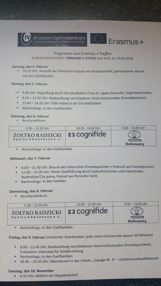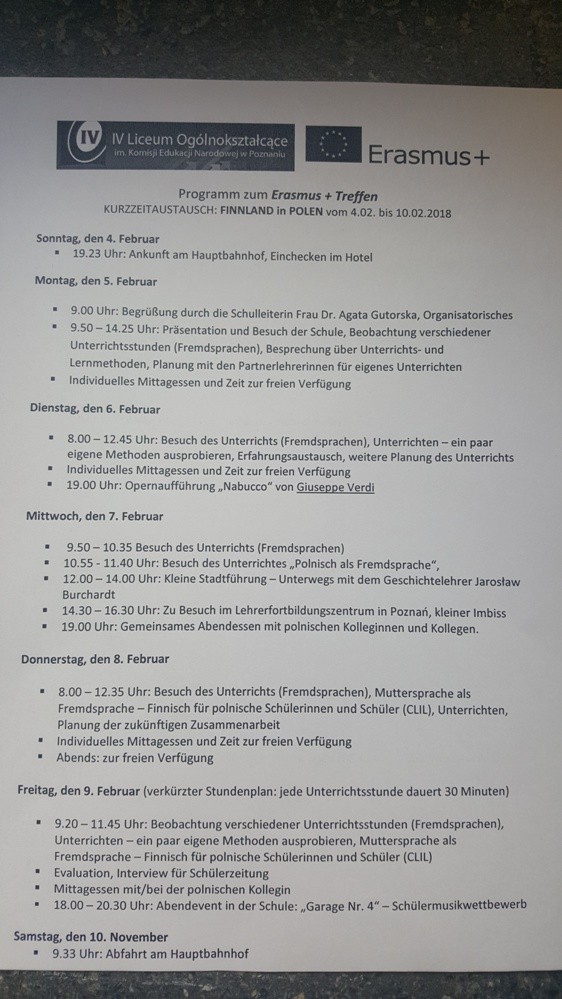 Kilku nauczycieli z naszej szkoły wraz z uczniami byli już na wymianie szkół partnerskich we Francji, Anglii, a w terminie od 04.02 do 10.02 nasi uczniowie pojechali do Niemiec, by nasza szkoła mogła ugościć przedstawicieli z Finlandii. Nauczycielka z Finlandii, Ulla Villa wraz z trojgiem swoich uczniów przez tydzień gościć będzie podczas lekcji w naszej szkole, obserwując i prowadząc lekcje w języku angielskim i niemieckim. Uczniowie z Finlandii, którzy przebywają u nas, dodatkowo biorą udział w praktykach zawodowych w firmie Cognifide, Toyota Bońkowscy oraz w Kancelarii Adwokackiej Żołtko – Radzicki. Plan zajęć i spotkań jest bardzo napięty i obfituje także w spotkania towarzyskie, kolacje, wyjścia do centrum, zwiedzanie Poznania. Dla IV LO udział w projekcie jest formą miedzynarodowej współpracy między szkołami, wymianą uczniowską i nauczycielską, wymianą doświadczeń, a także formą do wypracowania innowacyjnych metod uczenia się i nauczania z wykorzystaniem cyfrowych narzędzi.